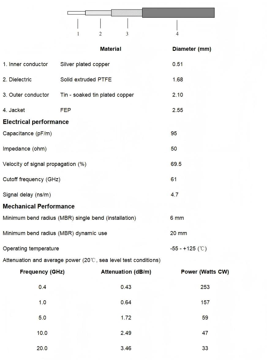 Formable RG405.086" Semi-Flexible Coax Cable with Tinned Copper Braid Outer Conductor and Blue FEP Jacket 1 Meter
