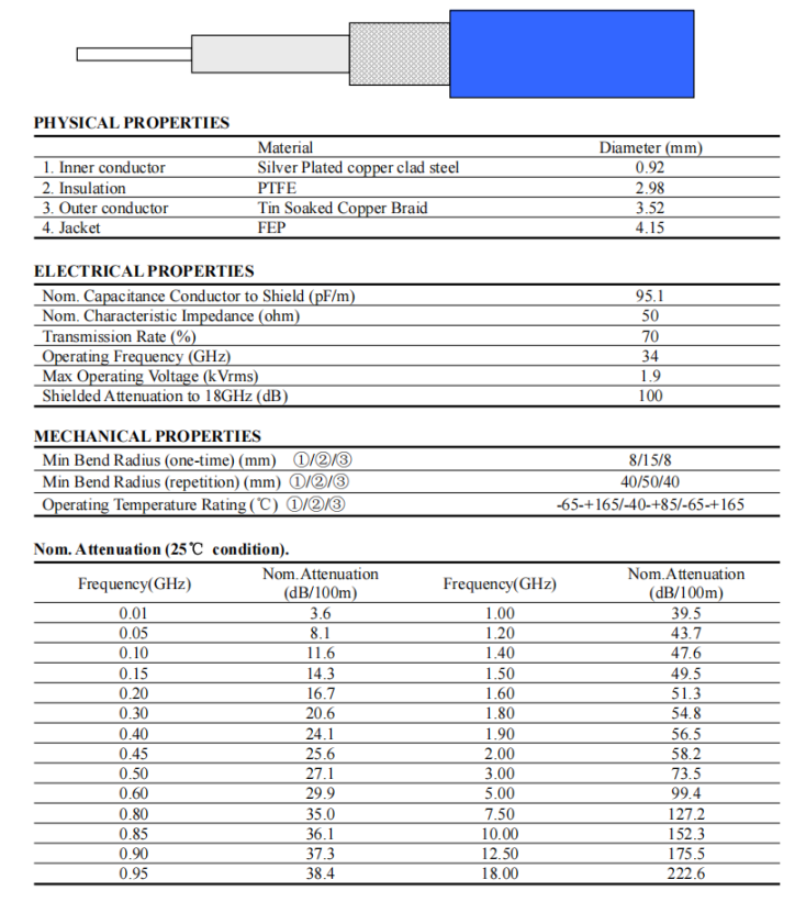 RG402 Tinned Coax Cable with Tinned Copper Braid Outer Conductor and Blue FEP Jacket 1 Meter