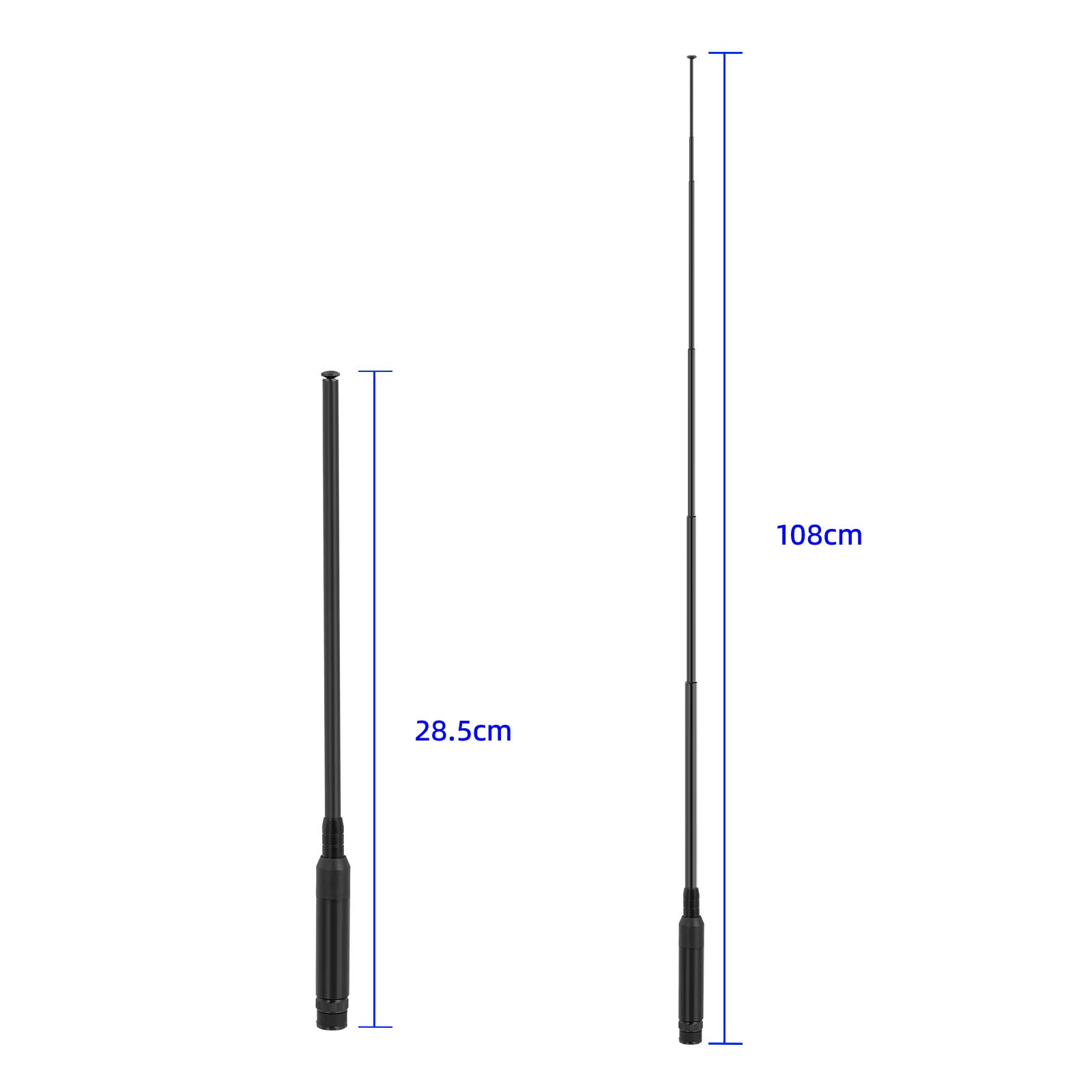 6-Section Telescopic Design: the antenna can be retracted and extended, adjustable from 28.5CM to 108CM;Made from high-quality metal materials with an ABS casing for durability.. When extending, start from the base to ensure smooth operation and prevent damage