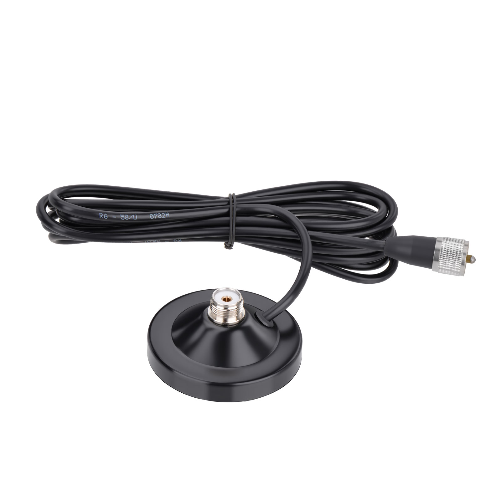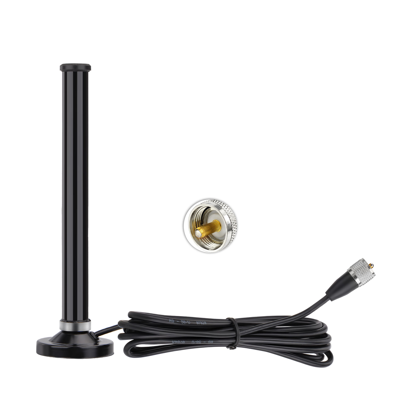 Antenna Feature: Strong Magnetic Base Mounting; Antenna Length: 25 cm/9.84 inches; Magnetic Base Cable: 5m/16.4ft RG58/U Cable;Cable Connector: UHF PL259 Male Connector; Maximum power: 50 watts.